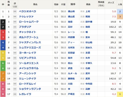 メンバー唯一の牝馬です。ノーザンファーム生産馬のG1馬で勝つ可能性がある1頭ですが大外枠が気になります。