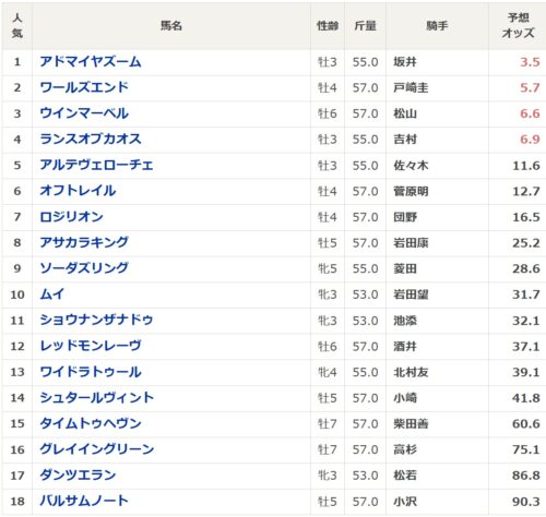 特に3歳馬は連対率は3割超とアベレージは最も高いため、アドマイヤズーム、アルテヴェローチェ、ショウナンザナドゥ、ランスオブカオス、ムイあたりは評価が上がります。