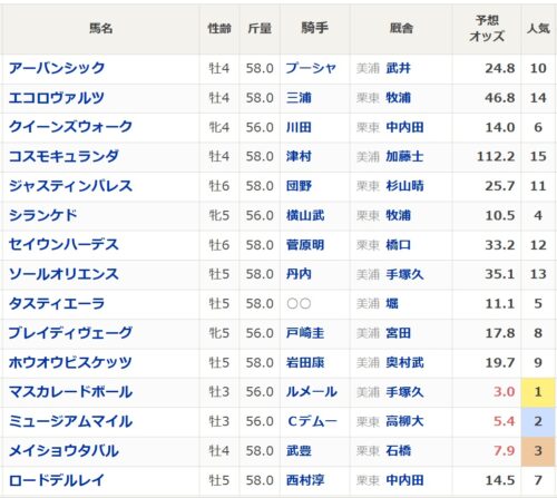 今年の1番人気は3歳馬のミュージアムマイルかマスカレードボールのどちらかになりそうです。今年は3歳馬が勝利する可能性が高いでしょう。