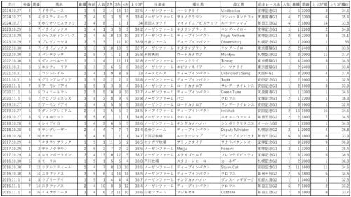 ノーザンファーム(8-6-6-46)出走頭数が多いながらも複勝率が30.3%あります。馬券圏内の半数以上がノーザンファーム生産馬です。