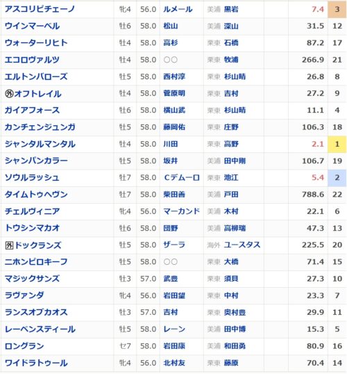 前走4人気 0-2-1-13⇒エルトンバローズ、ソウルラッシュ、ラヴァンダ、ランスオブカオス