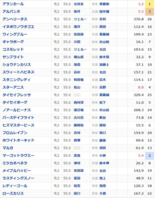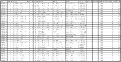 該当馬はアランカール、スターアニス、マルガの3頭と地方(園田)になりますがローズカリスを入れて4頭と該当馬は少な目です。
