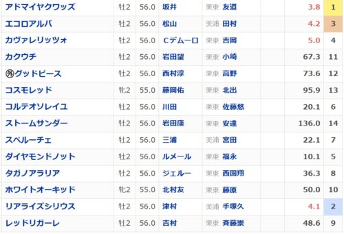 ここの項目から好走確率の高い馬はアドマイヤクワッズ、エコロアルバの2頭が勝ちに近いことになります。