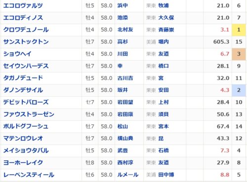 今年の登録馬だと意外に少なくエコロディノス、クロワデュノール、ショウヘイ、ヨーホーレイクの4頭となります。